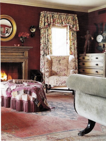 The master bedroom: House Beautiful did not show any pictures of this room. It is captured here from Cargill's web site, unstyled. The room has Chelsea Editions fabric wall covering along with Chelsea Editions curtain fabric and furniture. To the left, you can barely make out an antique Swedish sofa.